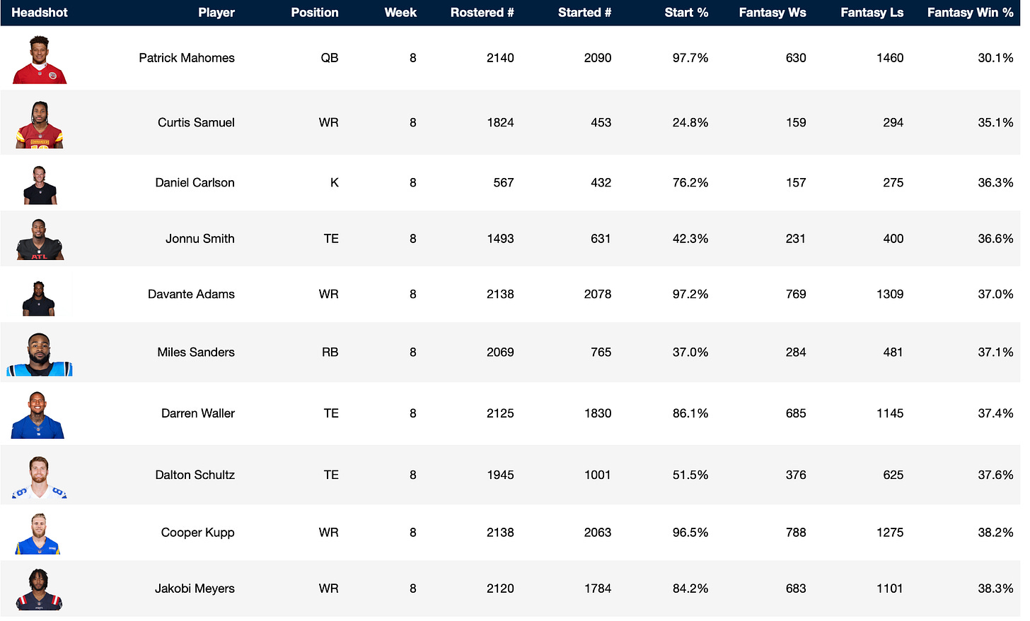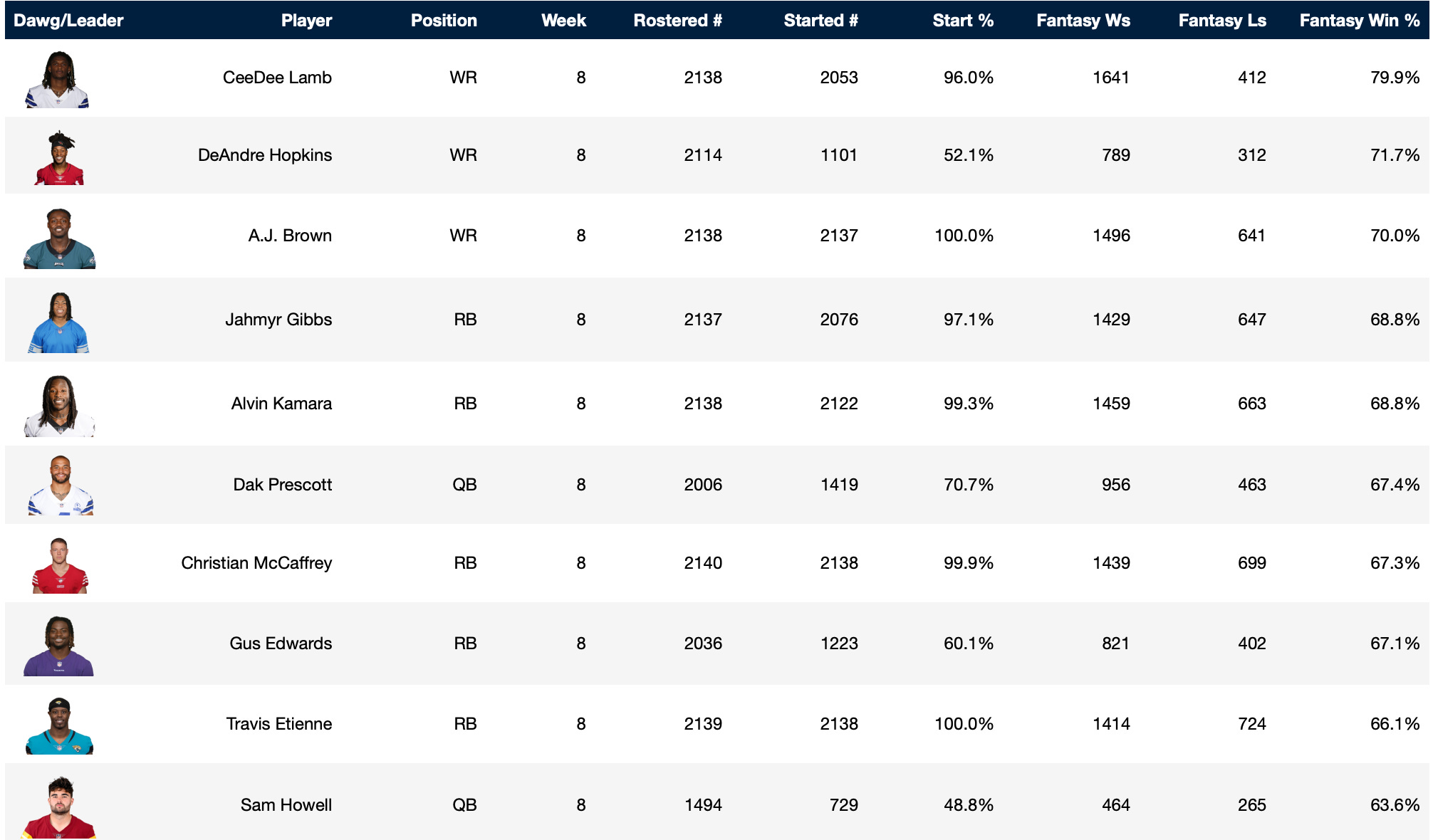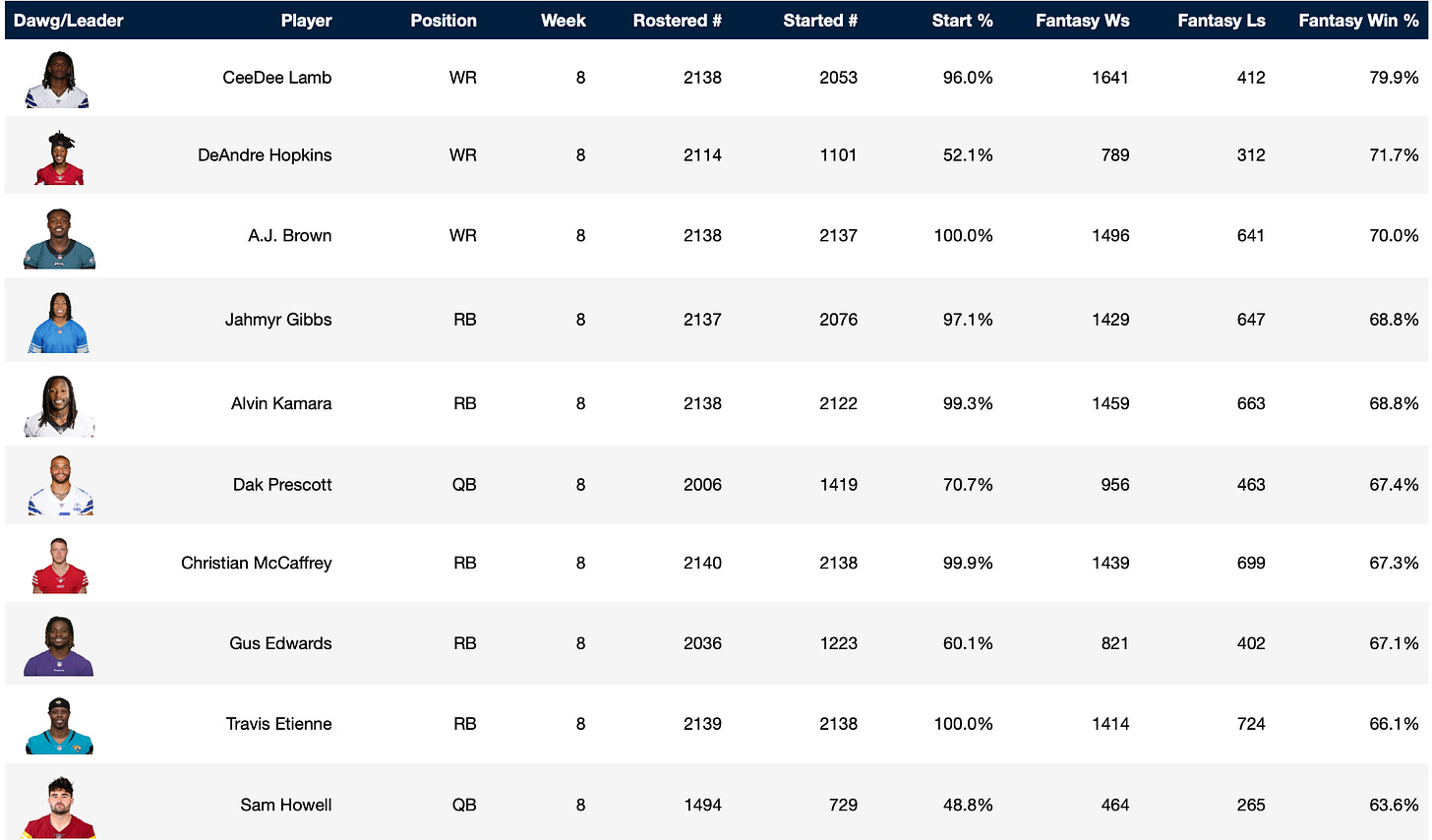 The Dawgs & Leaders are the top 10 players that contributed to a fantasy win when they were started. Largely some current studs or future studs on this list. And Sam Howell.