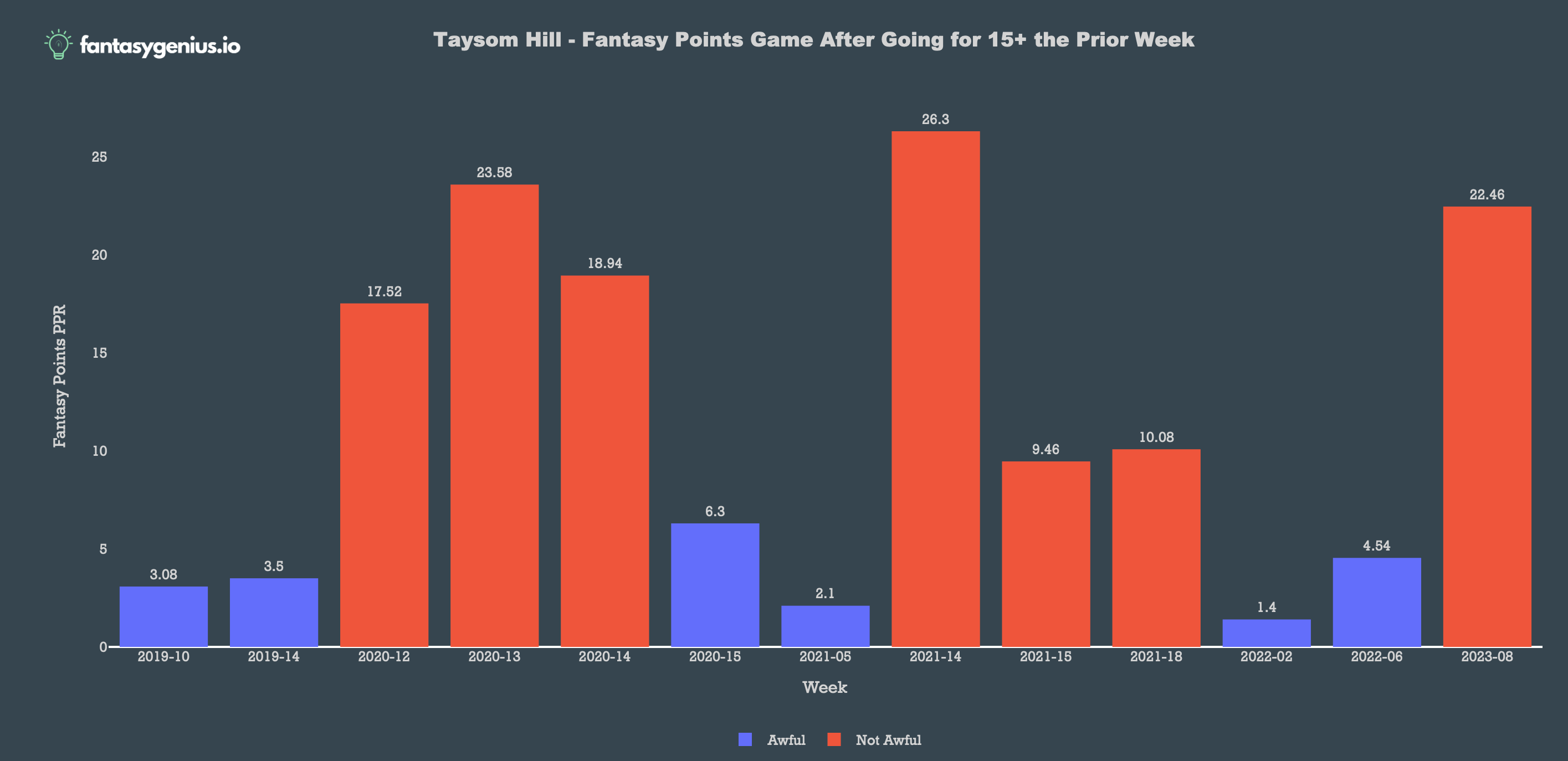 Here we take a look at every game Taysom had AFTER going for 15+ the week prior. He has had 2 distinct periods where he was just hot for a few weeks as you can see with both red spikes being all within a 3-4 game span. A lot of big duds in here though.