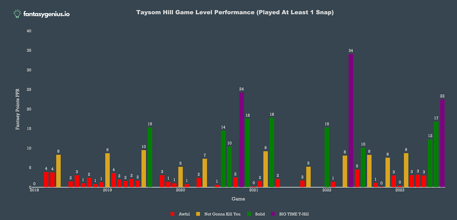 DeAndre Hopkins looking like the Undertaker out here coming back alive with 128 yards and 3TDs. His rookie QB Will Levis (rostered in 37% of leagues) was making his first start too. I don’t think anybody saw this Hopkins blowout coming as his start % across FG leagues was about 50%. So…I guess maybe half of the D-Hop holders saw it coming.