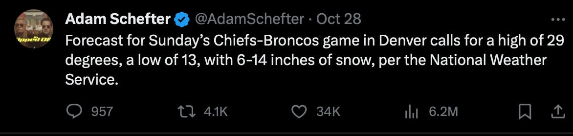 Mahomes had his worst game ever, dropping a 5.6 DUD on the elite Broncos in what was supposed to be a snow game and ended up….not being that. At all. I can’t think of a lower move from somebody than promising a snow game and being wrong. Jim Cantore would never mislead us like this.